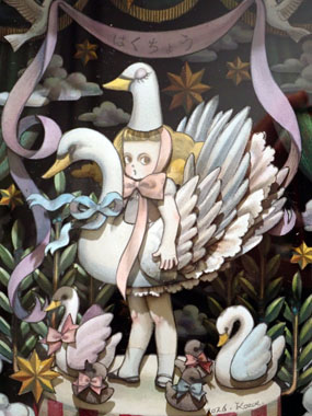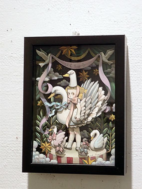 お遊戯会 はくちょう 20×15×3.5cm ¥49,500-(税込) 半立体(壁掛け可) 水彩画 水彩紙 鉛筆 透明水彩 素敵な舞台の上で演じる可愛い白鳥役の女の子。 奥行あるボックスの中に配置される世界がロマンティックで心がときめきます。 |