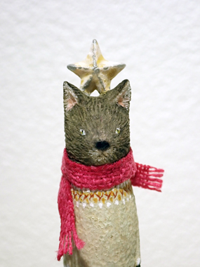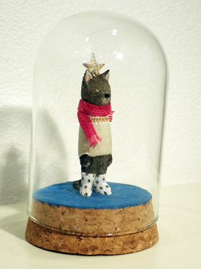 「おいらにおとずれた星〜水玉ソックス〜」 6.4cm ¥38,500(税込) 木彫り(ハードメープル) アクリル絵具で着彩 磁石で立ちます ガラスドーム付 星を頭に乗せた不思議な異星人? おとぎ話のような不思議で暖かな物語が紡がれる予感がします。 |