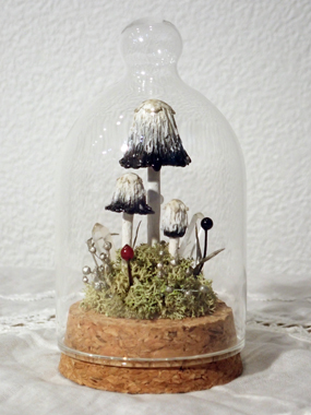 モモタマゴタケと蝶々 17cm 生革 粘土 レジン 花材 ガラス お伽噺に出てくるような愛らしいきのこ。 ビンに入って蝶々と一緒に標本になっています。 |