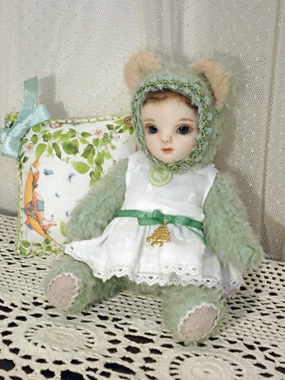 森の妖精(Nolle ノル) 17cm ¥51,700(税込) 着ぐるみ ビスク クロスボディ グラスアイ ジャーマンモヘア 化繊綿 ペレット クッション付 若草色の柔らかな身体が可愛い森の妖精。 深い青の瞳が知的な穏やかさを感じ、優しく見守るお姉さんのような子です。 |