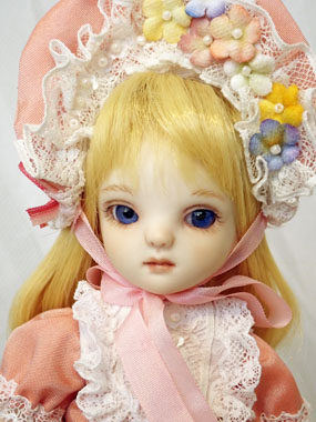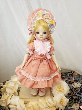 アプリコット 18cm ¥85,800(税込) 球体関節 ビスク グラスアイ ウィッグ シルク 綿ローン 布花 スタンド付 サーモンピンクのドレスに色とりどりの花のボンネットが可愛い少女。 柔らかな春らしい幼いこの子の澄んだ深く青い瞳が爽やかな風のようです。 |