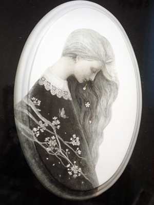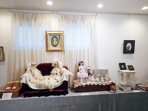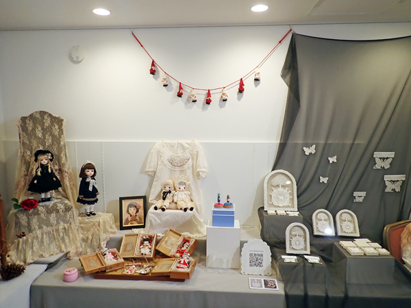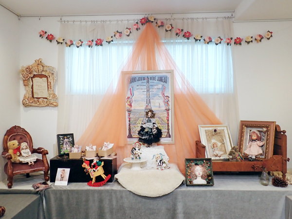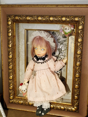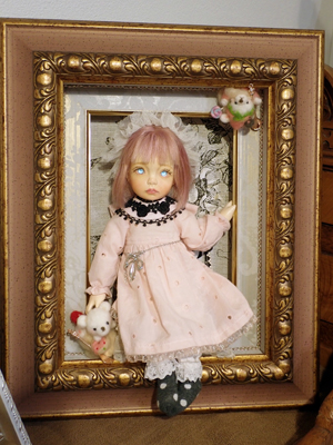 | ほそ乃梨恵 「額装シリーズ(小さな世界)」 秘密の箱庭 40×33×9cm人形30cm 粘土 クロスボディ 布 綿 瞳:ガラス・UVレジン 羊毛フェルト 布 レース ペレット 額・箱付 |