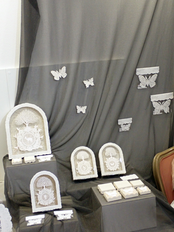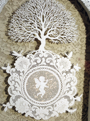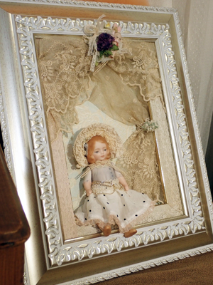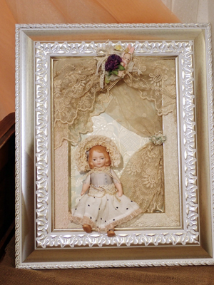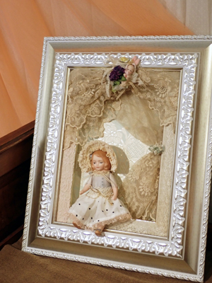 | ほそ乃梨恵 「額装シリーズ(小さな世界)」 星の隠れ家 38×30cm人形17cm ビスク クロスボディ 布 綿 描き目 布花 アンティークレース 額・箱付 |
