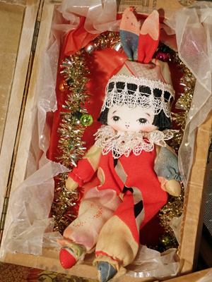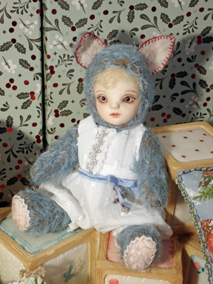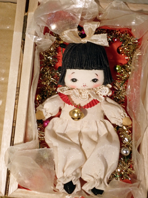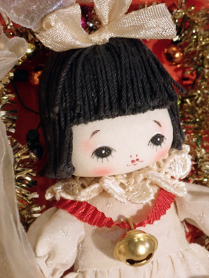 | つきもとつきこ 「ちいさい人 鈴とりぼん」 14cm 文化人形 手足:アンティーク正絹 服:デッドストック合繊生地生 |