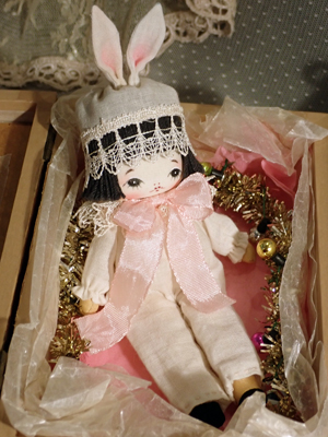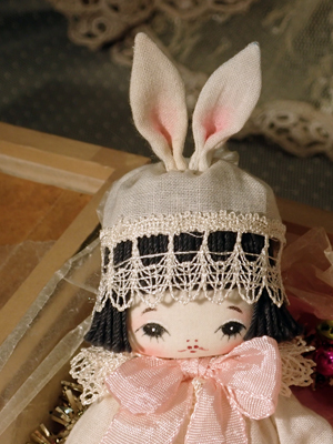 | つきもとつきこ 「ウサ・耳子(白)」 14cm 文化人形 手足:アンティーク正絹 服:アンティーク木綿(着物地) |