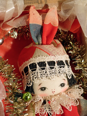 | つきもとつきこ 「ウサ・耳子(赤)」 14cm 文化人形 手足:アンティーク正絹 服:アンティーク着物地 モスリン |