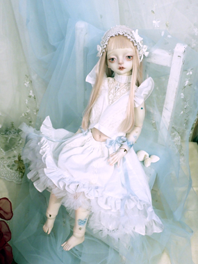 泡沫 50cm ¥275,000(税込) 球体関節 ビスク 化繊毛 自作のグラスアイ 水しぶきのような広がったような裾や肌の鱗模様の少女。 蕩けるような眼差しの不思議な瞳や薄く開けた唇がこの世のものとは思えない美しさです。  |