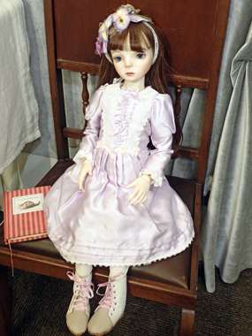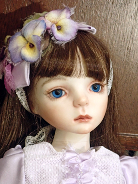 フローラ 48cm ¥220,000(税込) 球体関節 ビスク グラスアイ ウィッグ貼付 シルクドレス スタンド付 長い黒髪に神秘的な青い瞳、白皙の肌が初々しい少女。 花々に彩られたヘッドドレスが清楚な彼女をロマンティックに仕立てています。 |