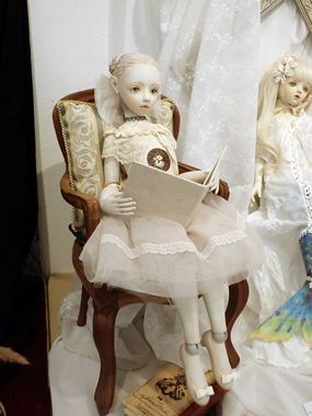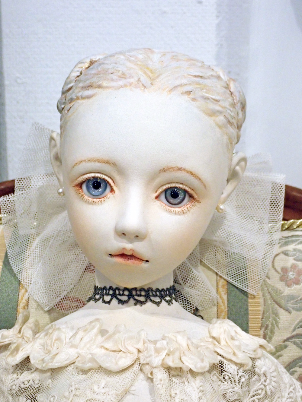 Blue Rose 73cm ¥275,000-(税込) 球体関節 粘土 グラスアイ 化繊ヘア アンティークドレス 膝は二重関節 古い映画のようにノスタルジックな少女。 野に咲く白い花のように可憐でその青い瞳は透き通るように清純な美しさを湛えています。  |